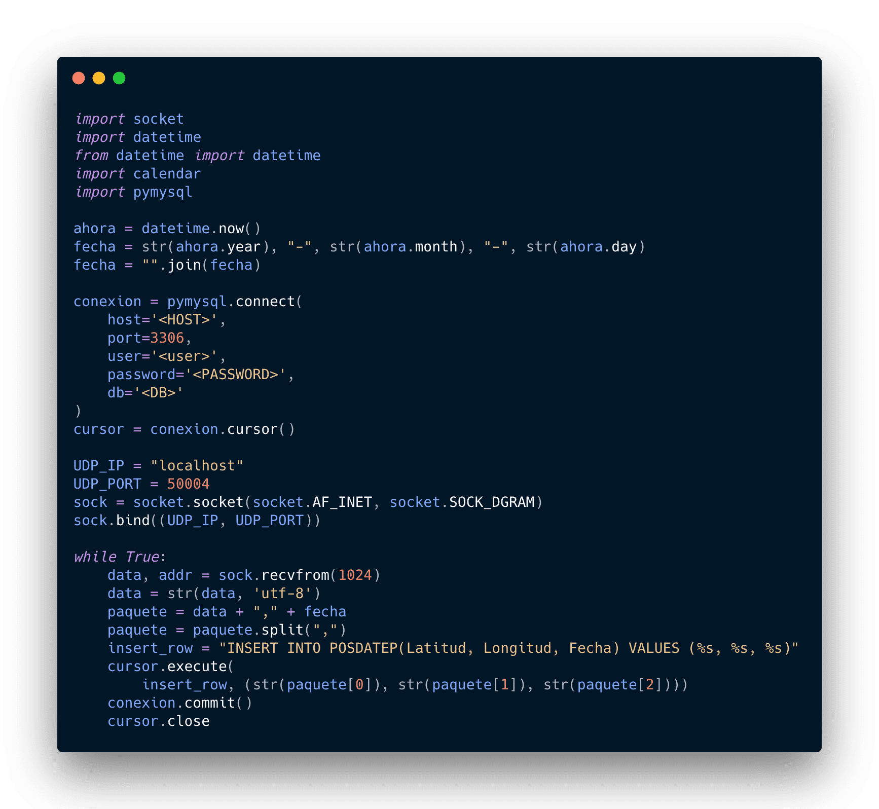 Después de tener el envió de paquetes resuelto creamos nuestro propio sniffer para leer dichos paquetes y guardarlos en una base de datos, una RDS en AWS, como podrán observar en el siguiente script en python.