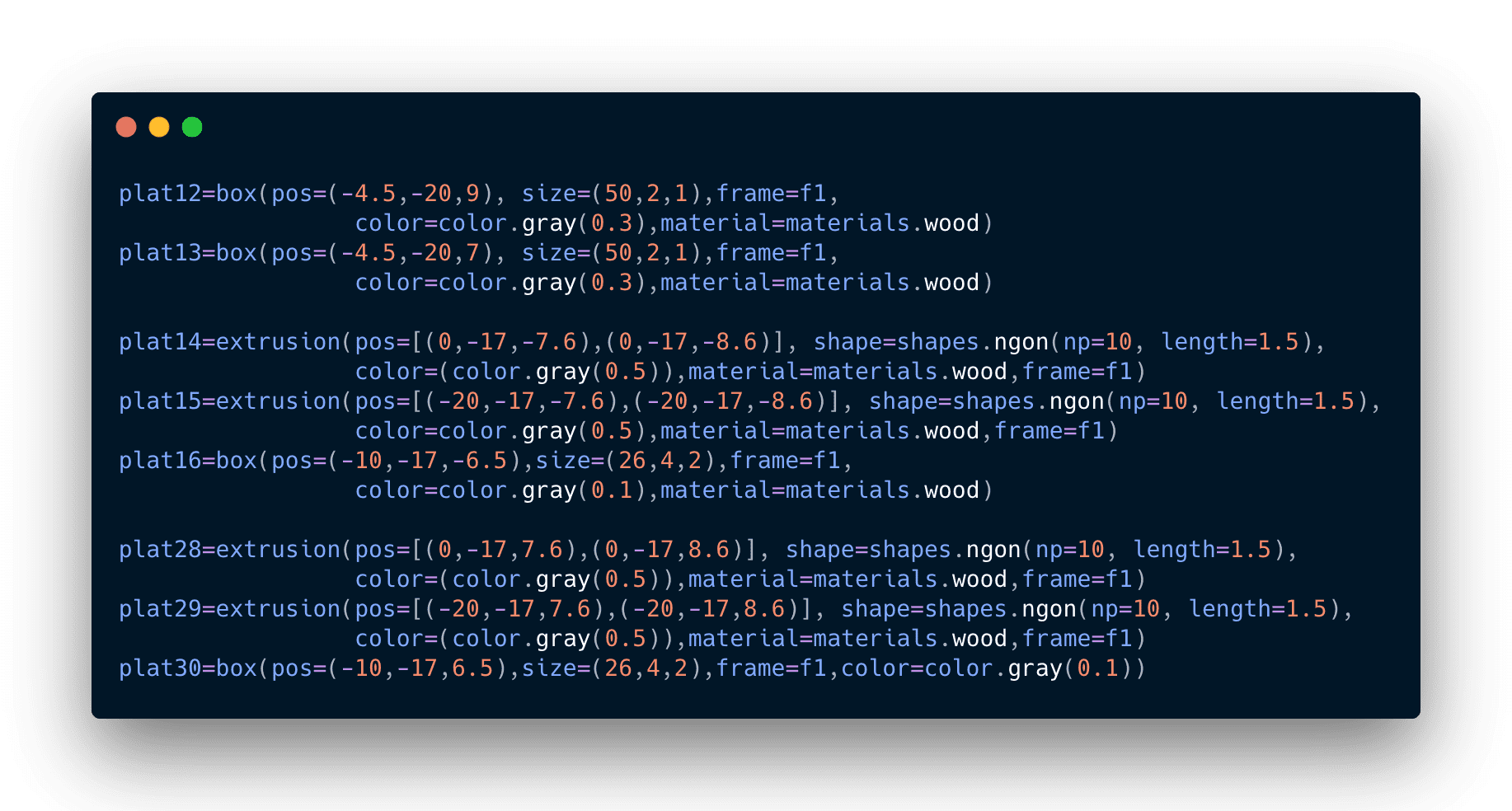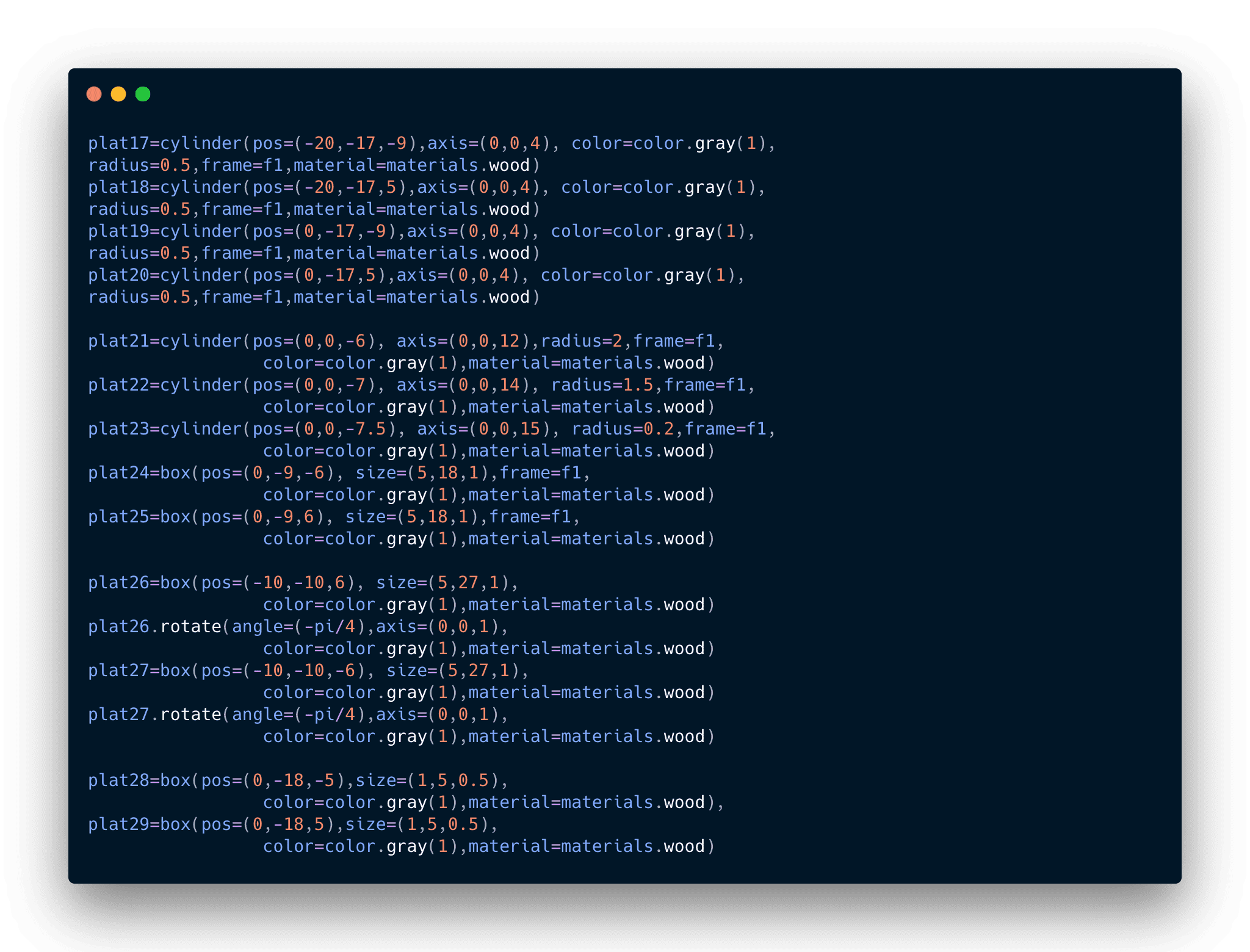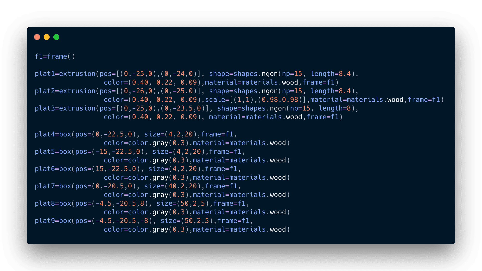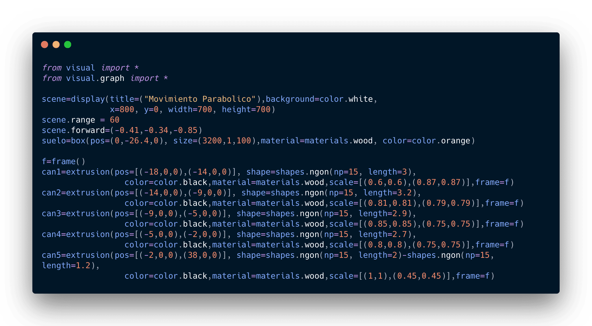 Debido a que había trabajado con software de modelado 3D anteriormente no me resulto muy complicado aprender como modelar a través de código. A continuación se puede observar el código para crear el cañón como tal: