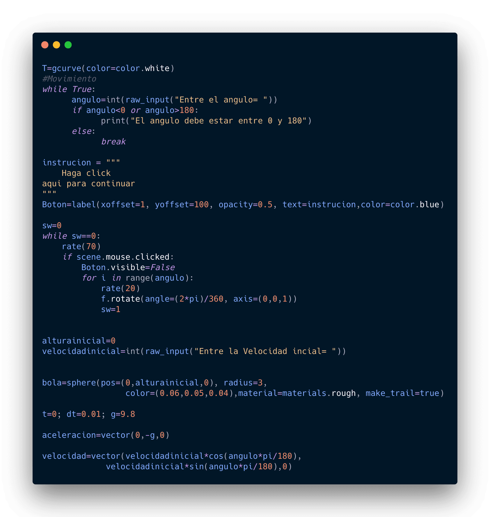 Aquí también implemente una lógica de modo que fuera posible configurar las condiciones iniciales de la simulacion, tales como: velocidad inicial del proyectil y ángulo de inclinación del cañón.