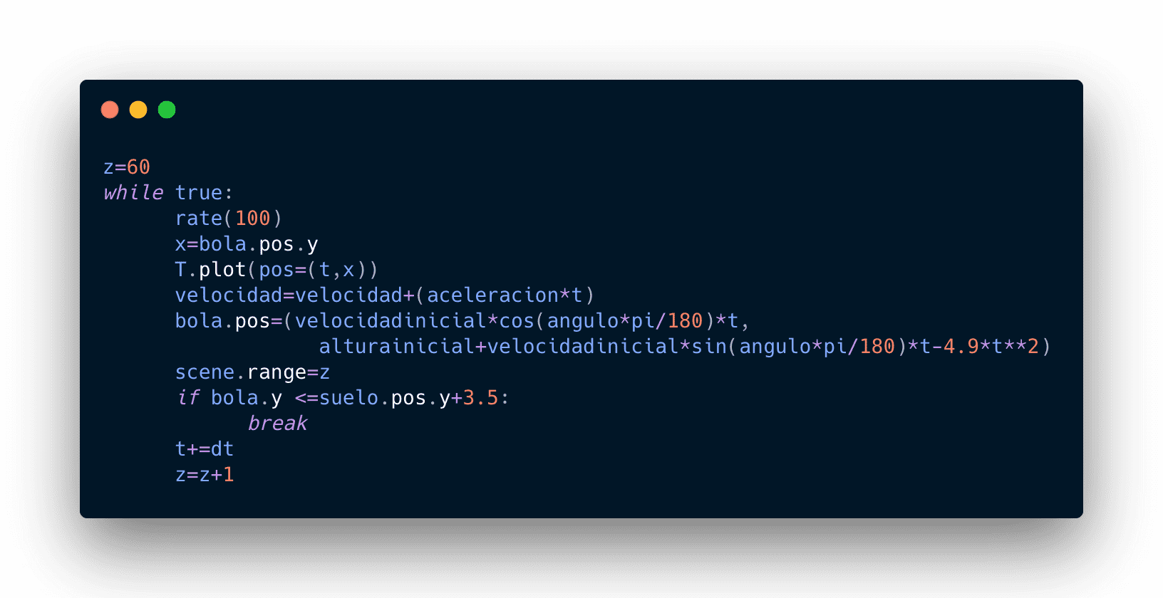 Por último, implemente las ecuaciones que describen el movimiento en cuestión